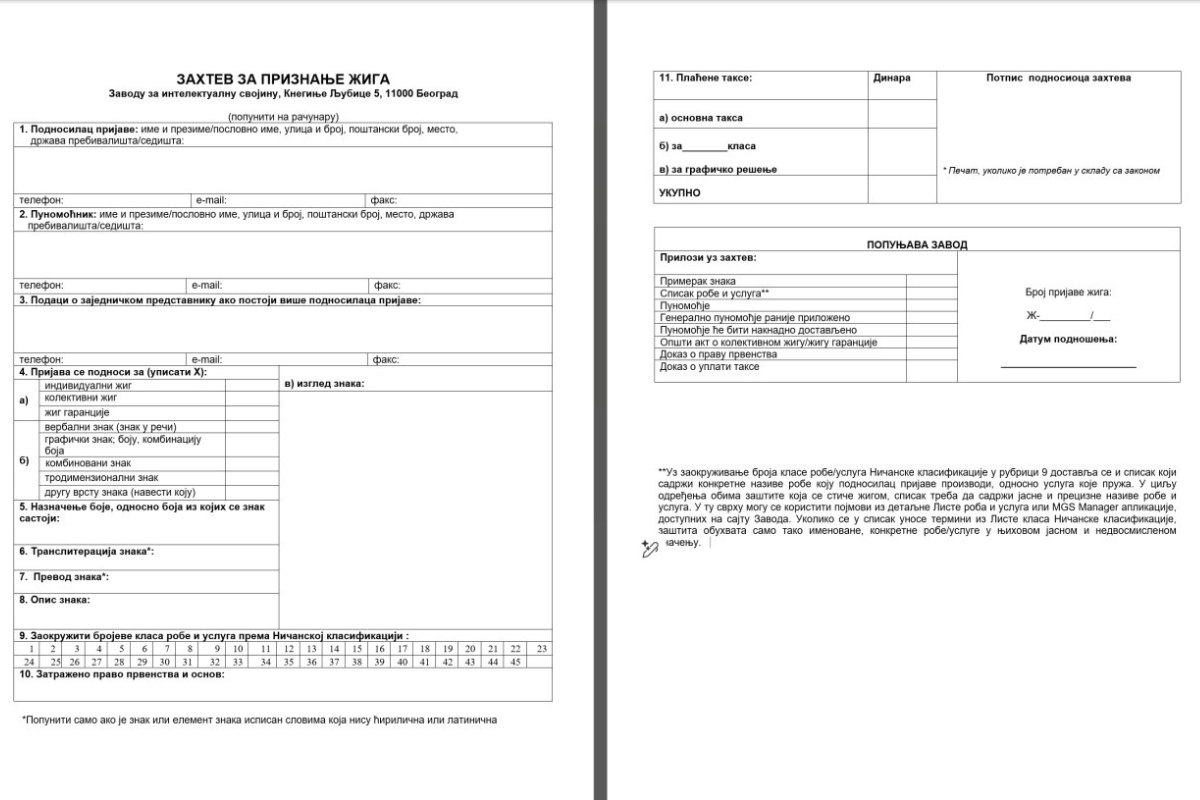 - Poštom – šalje se preporučeno, sa svim prilozima (popunjen zahtev u dva primerka, grafički prikaz znaka u 2 primerka (8 x 8 cm), dokaz o uplati, spisak roba/usluga po klasama).