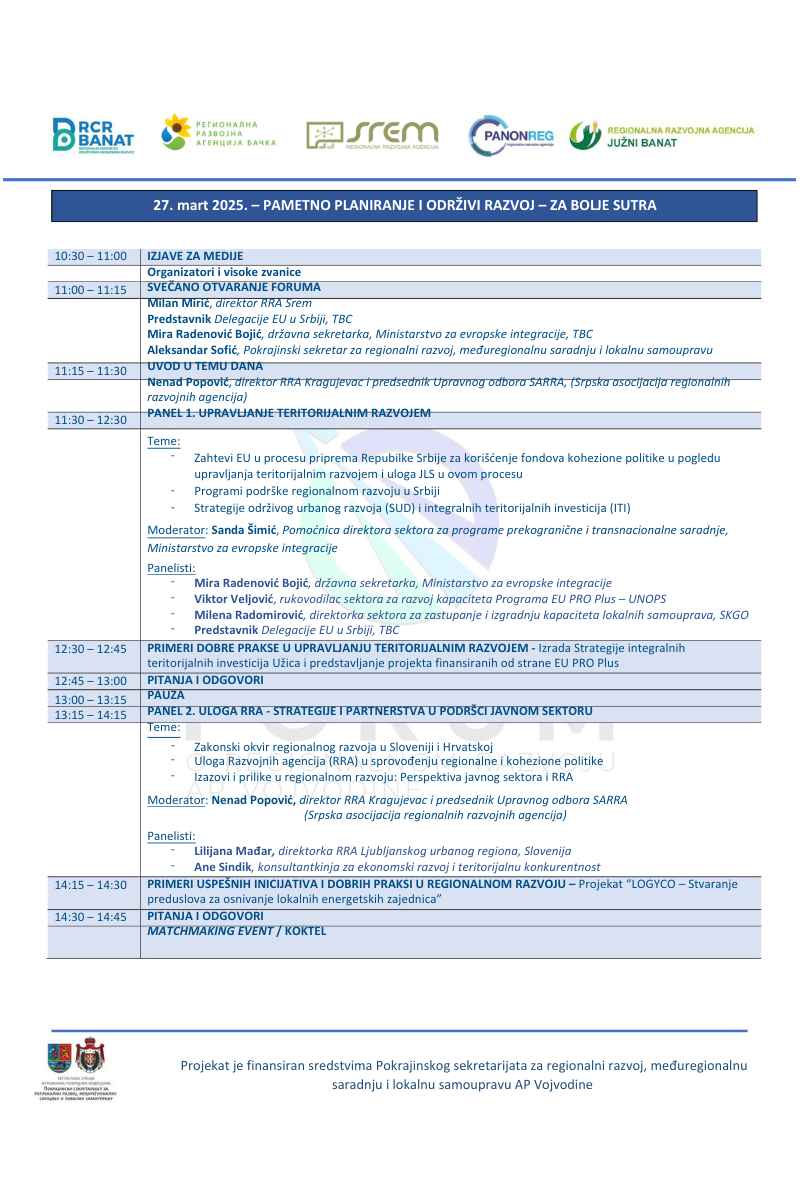 Forum je prilika da se upoznate s aktuelnim trendovima u oblasti regionalnog razvoja, učestvujete u diskusijama o izazovima i mogućnostima, te pronađete potencijalne partnere za buduće projekte.