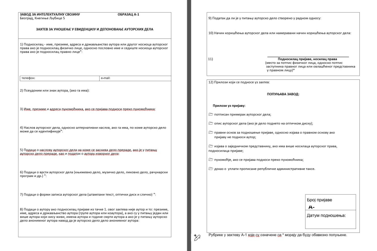 Postupak započinje podnošenjem zahteva za zaštitu autorskih prava. Formular možete dobiti u prostorijama Zavoda ili preuzeti preko zvaničnog sajta, na sledećem linku: https://www.zis.gov.rs/uputstva-i-obrasci/?cat=autorska-i-srodna-prava (Захтев за уношење у евиденцију и депоновање ауторских дела Образац А-1).